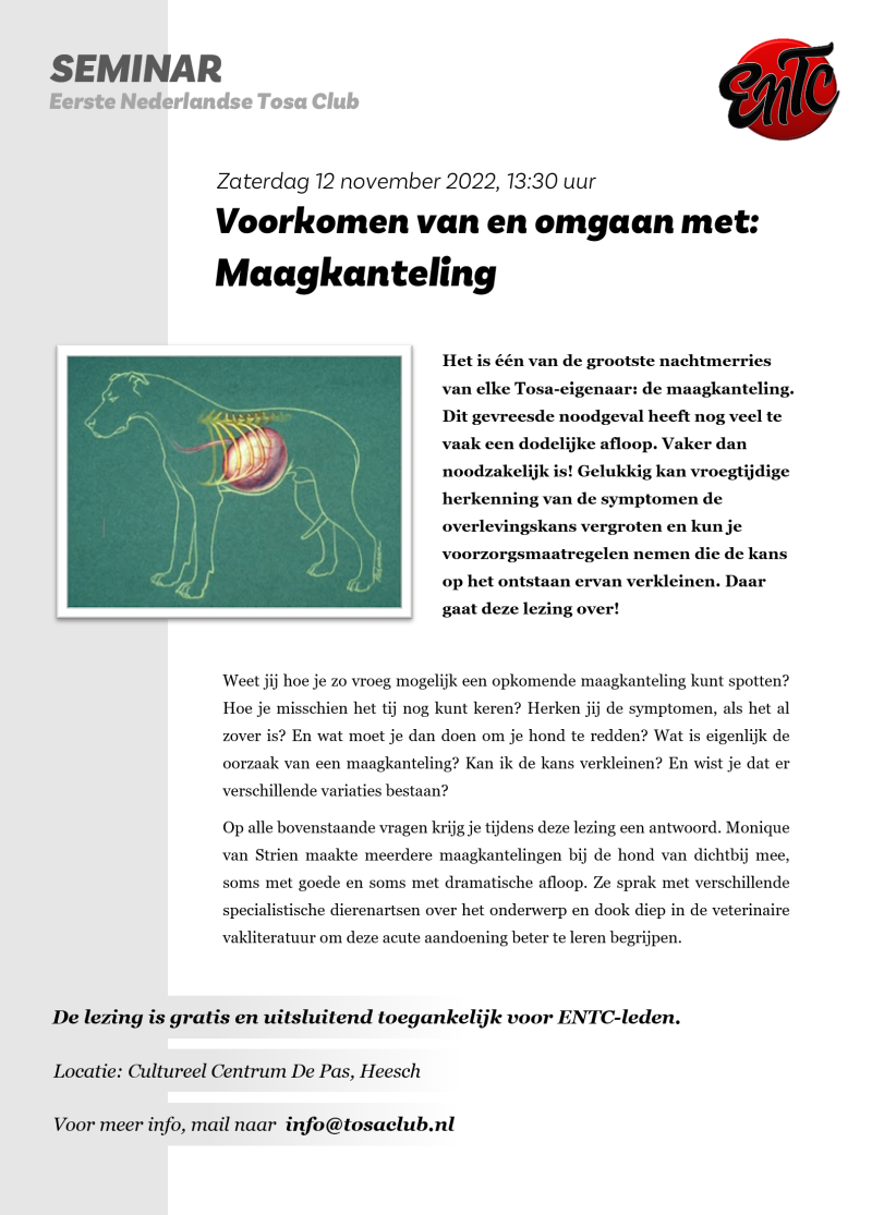De leden van de ENTC hebben per mail een uitnodiging met daarin extra informatie ontvangen. Indien de contributie is voldaan, zijn zij van harte welkom om de ALV bij te wonen! We lopen warm met een lezing met als onderwerp "Voorkomen van en omgaan met: Maagkanteling". De lezing is gratis en uitsluitend toegankelijk voor leden.